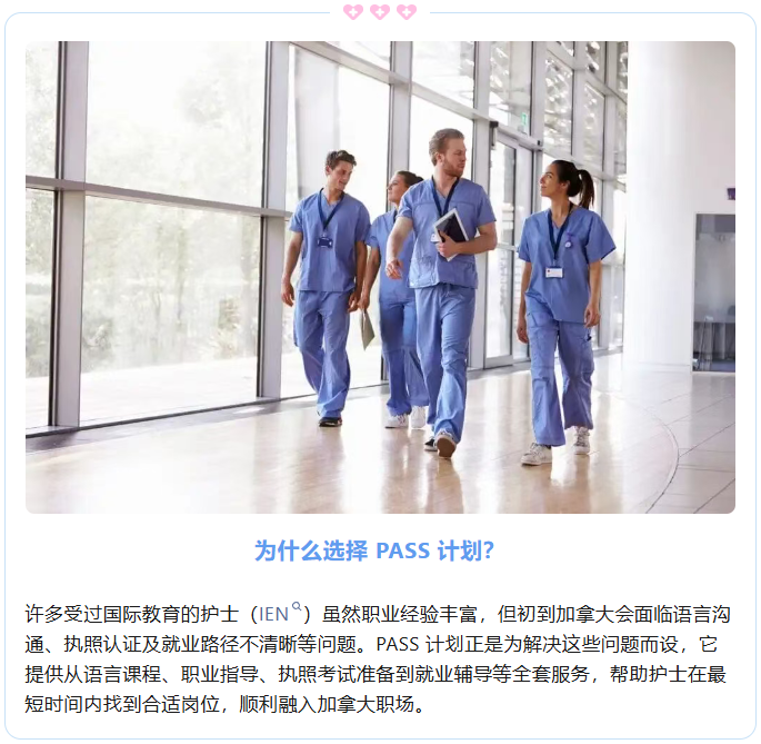 随着加拿大医疗体系对护士人才的需求不断增加,越来越多的海外护士希望在加拿大继续职业发展。为了帮助他们更快、更顺利地融入本地医疗行业,加拿大联邦政府推出抵达前与抵达后支持与服务计划(Pre-Arrival and Post-Arrival Supports and Services Program, PASS)。